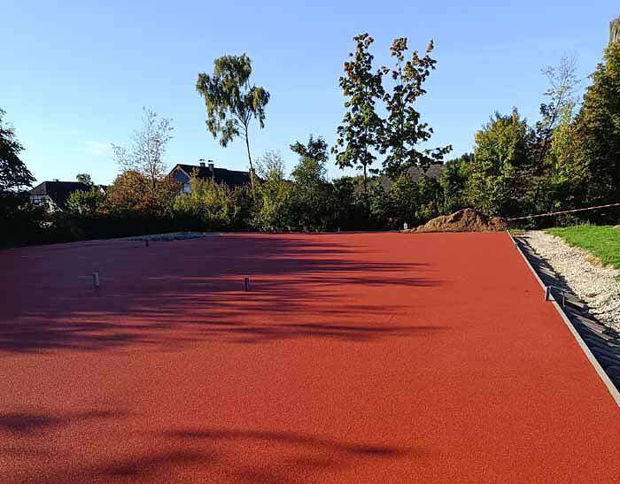 Zwischenzeitlich sind die Arbeiten bereits in großen Schritten fortgeschritten: So konnte inzwischen der elastische Bodenbelag eingebaut werden, der für Sicherheit und Vielseitigkeit bei der sportlichen Nutzung sorgt. Als nächster Meilenstein wird am Samstag, den 27. September 2025, die Bandenanlage des Spielfeldes aufgebaut.